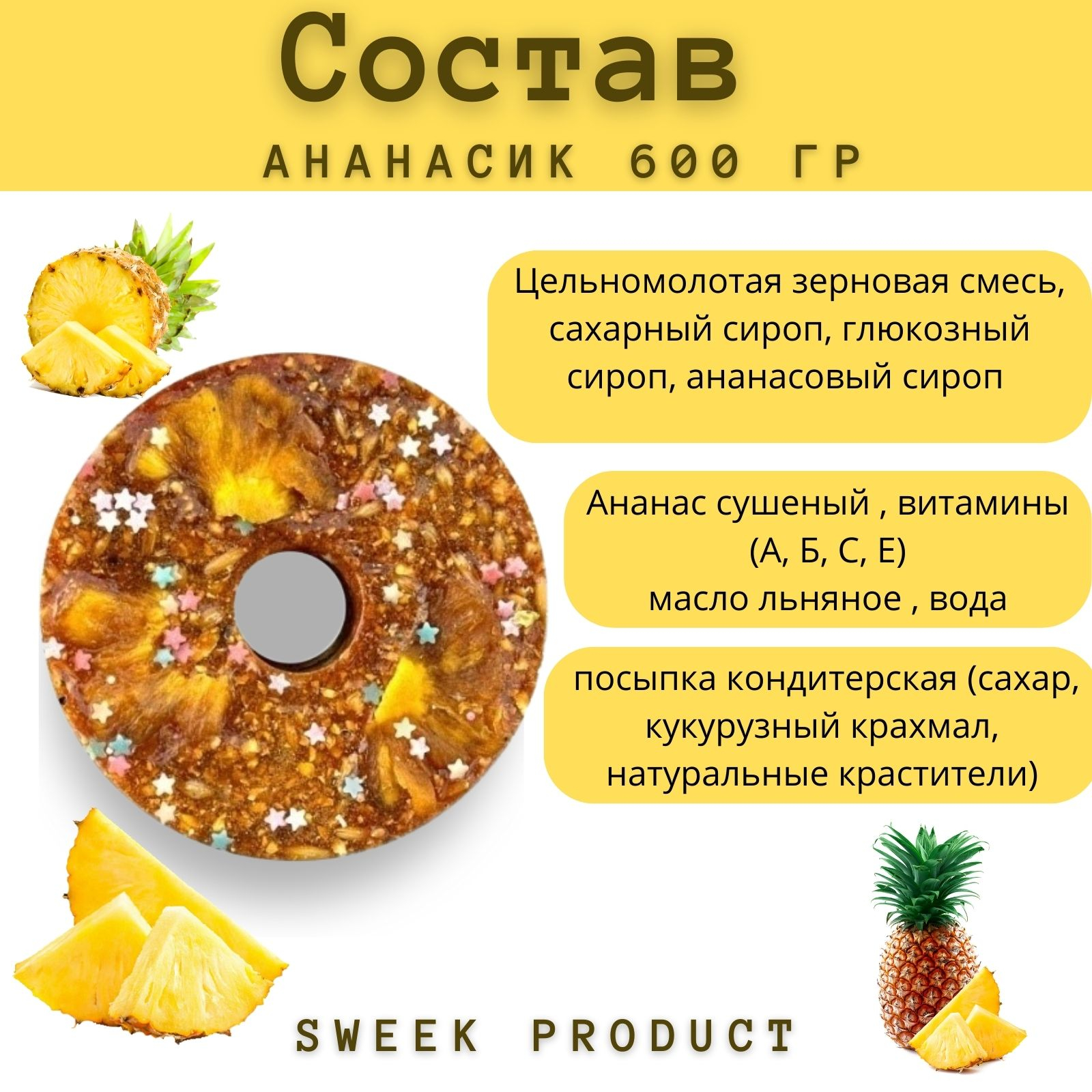 Цельномолотая зерновая смесь (ячмень, пшеница, кукуруза), сахарный сироп, глюкозный сироп, ананасовый сироп, ананас сушеный, витамины (А, В, С, Е), масло льняное, вода, посыпка кондитерская (сахар, кукурузный крахмал, натуральные красители).