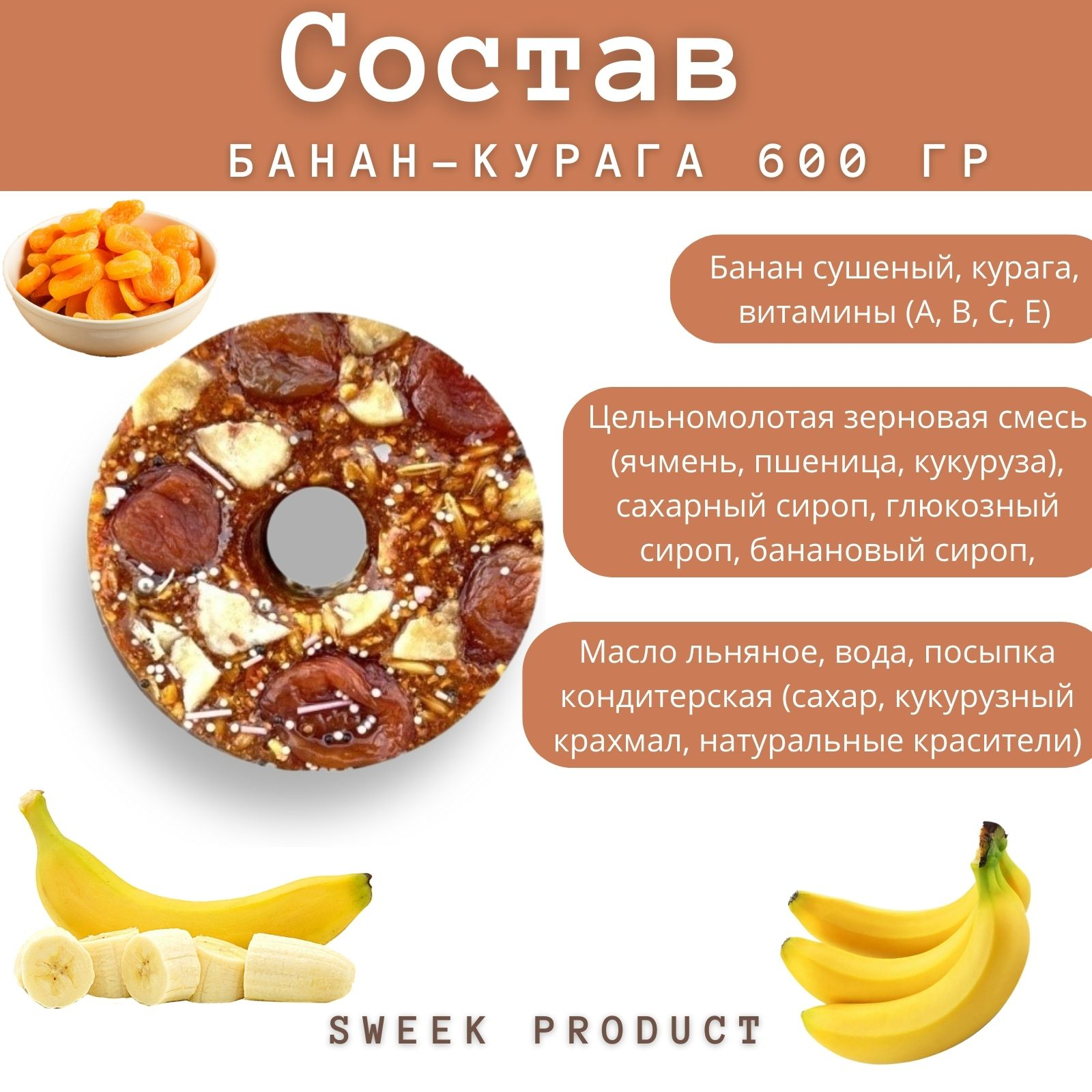 Цельномолотая зерновая смесь (ячмень, пшеница, кукуруза), сахарный сироп, глюкозный сироп, банановый сироп, банан сушеный, курага, витамины (А, В, С, Е), масло льняное, вода, посыпка кондитерская (сахар, кукурузный крахмал, натуральные красители).