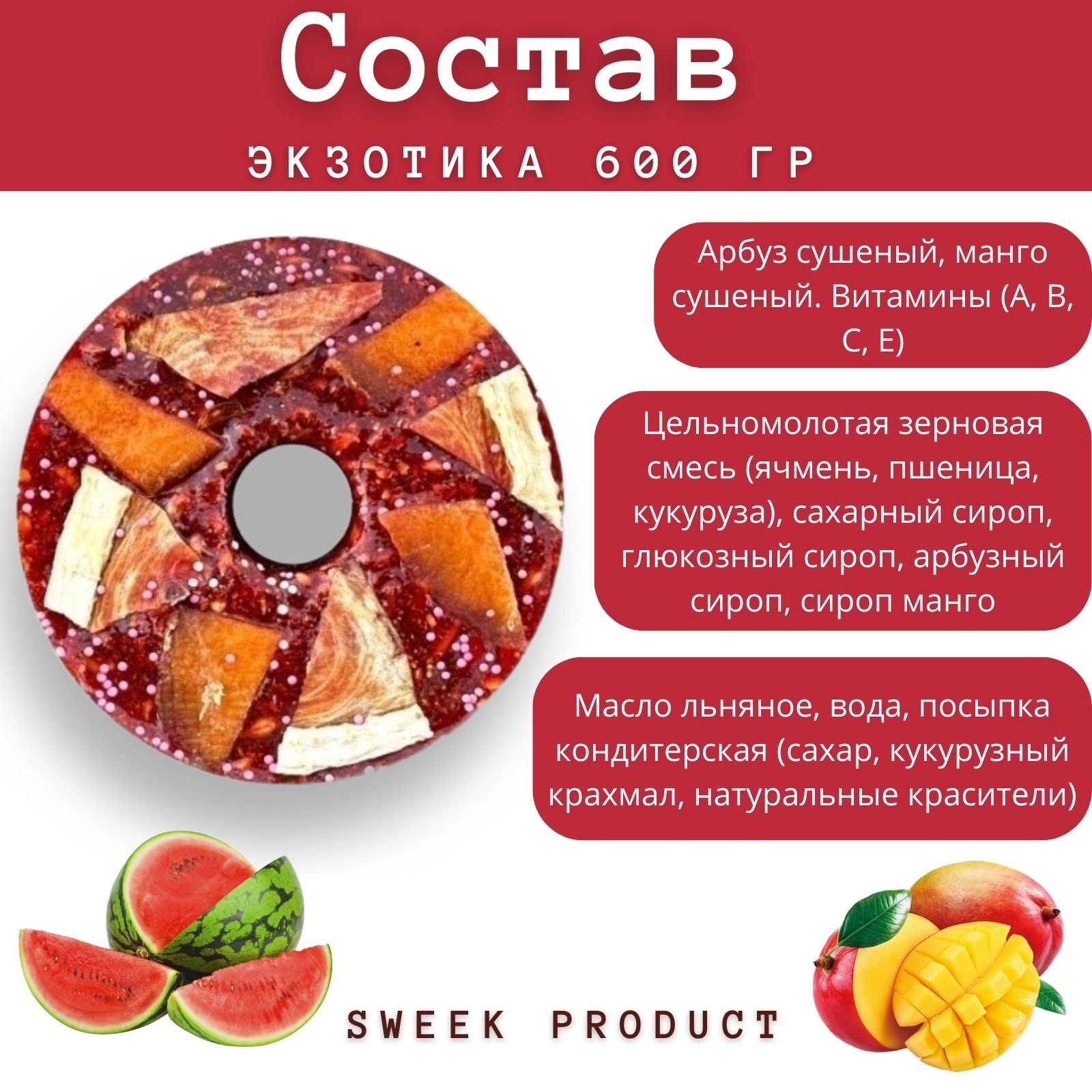 Цельномолотая зерновая смесь (ячмень, пшеница, кукуруза), сахарный сироп, глюкозный сироп, арбузный сироп, сироп манго, арбуз сушеный, манго сушеный, витамины (А, В, С, Е), масло льняное, вода, посыпка кондитерская (сахар, кукурузный крахмал, натуральные красители).